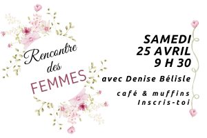 Mesdames ! Nous avons une rencontre à venir pour les femmes : Samedi 25 avril à 9 h 30 Avec café & muffins Notre sœur Denise Bélisle apportera le message. S’inscrire à l’avance en suivant le lien ci-dessous ou sur la feuille à la librairie. https://rsvp.church/r/JOcmgYir